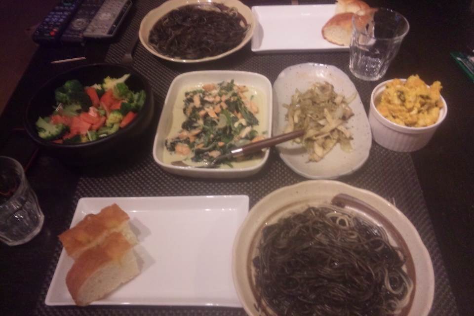 今日はお客様に頂いたスプマンテを飲むぞ~~! ということで、夕食はイカスミのパスタ、サーモンとほうれん草の豆乳チーズソース、エリンギバジル、かぼちゃのサラダ、水菜とトマトとブロッコリーの和風サラダとフォカッチャ。